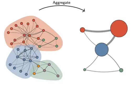 We then convert each community in into a single node. Note how, as is depicted in the above image, the communities of are used to sort these aggregate nodes after their creation.