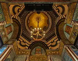 According to Aitchison and Walter Crane, the design was based on the palace of La Zisa in Palermo.[7] The 17th-century tiles are complemented by carved wooden lattice-work windows of the same period from Damascus. There are also large 16th-century Turkish tiles. The west wall has a wooden alcove with inset 14th-century tiles.