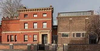 Aitchison designed the first part of the house (2 Holland Park Road, later renumbered as 12) in 1864, although Leighton was not granted a lease on the land until April 1866.[5] Building commenced shortly afterwards, and the house, which cost £4500, equivalent to £558,877 in 2023, was ready for occupation by the end of the year.[6] The building is of red Suffolk bricks with Caen Stone dressings in a restrained Classical style.