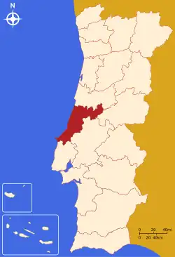 The District of Leiria (Portuguese: Distrito de Leiria [lɐjˈɾi.ɐ] ⓘ) is a district located between the Oeste e Vale do Tejo and Centro regions of Portugal, and divided between the traditional provinces of Beira Litoral and Estremadura. It borders on the north with district of Coimbra, on the east with district of Castelo Branco and with district of Santarém, on the south with district of Lisbon and on the west with the Atlantic Ocean. The district capital is the city of Leiria.