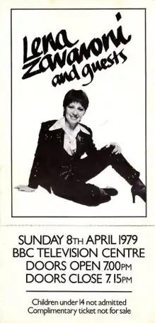 ![]() Ticket for the recording of Lena Zavaroni and Music at the time of recording the show was called Lena Zavaroni and Guests (1979). | |
