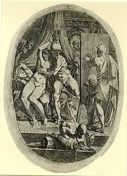 Léon Davent was a French printmaker in the mid 16th century, closely associated with the First School of Fontainebleau. He worked in both engraving and etching and many of his works are based on designs by Francesco Primaticcio, "rendered boldly and freely".[1] Others use designs by Luca Penni and other artists. It is thought that there was a workshop at the Palace of Fontainebleau itself in the 1540s, where he was one of the leading printmakers. Their main purpose seems to have been to record the new style being forged at Fontainebleau, copying both the main subject paintings and the elaborate ornamental stuccos and other decorations.