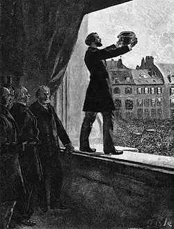 Parisians broke into the Palais Bourbon, meeting place of the Chamber of Deputies, interrupting a session and calling for a Republic. Later that day, from the Hôtel de Ville, Gambetta proclaimed the French Republic to a large crowd gathered in the Place de l'Hôtel-de-Ville:[6]