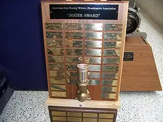 In reflection of Sirois' infamous 1969 hard-luck qualifying gaffe, the American Auto Racing Writers & Broadcasters Association (AARWBA) created an annual award for the Indianapolis 500.[5] The plaque consists of a gold-colored metal whiskey jigger attached to a base, awarded to the year's "hard-luck" driver during qualifying. Selection criteria are very loose, and "blanket" awards for the entire month have been selected on more than one occasion. The recipient is usually one of the last drivers bumped from the field, or a driver who fails to qualify (especially if he/she made several unsuccessful attempts). Drivers that fail to qualify under unusual circumstances are a common theme.