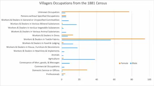 The first census of 1801 divided the population into those 'chiefly employed in agriculture', those 'chiefly employed in trade, manufacturers or handicraft', and others. From 1841 onwards, information was gathered on each person's occupation forming a detailed data set. By 1881 a more organised classification was used in the county level tables covering 414 categories. This information is displayed as a table on the right of the page.[25] The figures show that despite the loss of the cottage weaving industry in the village, textiles along with agriculture, and domestic service were the predominant occupations.