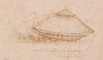 The concept was designed while Leonardo da Vinci was under the patronage of Ludovico Sforza in 1487.[2] Sometimes described as a prototype of modern tanks, Leonardo's armored vehicle represented a conical cover inspired by a turtle's shell. The covering was to be made of wood and reinforced with metal plates. Slanting angles would deflect enemy fire, similar to sloped armour today. The machine was powered by two large cranks operated internally by four strong men. The vehicle was equipped with an array of light cannons, placed around the perimeter.[3]