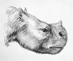 In Leontinia, the first incisors of the upper jaw are small cropping teeth, while the second are elongated and form caniniform tushes. In the lower jaw it is the third incisors have developed into tusks, not the second. Variations and incisor length have been used to distinguish different species from one another and may possibly provide evidence of sexual dimorphism among certain species. In fact, it has been suggested that different species assigned on the basis of tooth proportion may only represent different genders of the same species.[2] The nasal bones are highly elevated from the nasal cavity and suggest that the animal may have possessed horns resembling those of the rhinocerotid Diceratherium.