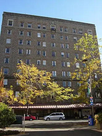 The current 9-story hotel tower was constructed in 1929, on the site of the original 1899 structure, which was demolished. The tower was designed by architects from H.L. Stevens & Company, of San Francisco, and increased the hotel's room count to 300.[4]