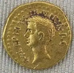 ![]() Denarius of 42 BC depicting Lepidus, aged about 57. The inscription reads III v(ir) r(ei) p(ublicae) c(onstituendae) Lepidus pont(ifex) max(imus), meaning "Triumvir for the regulation of the republic, Lepidus, Pontifex maximus". | |
