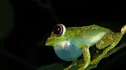 Adult L. grandiceps are slender with pointed snouts and large heads. The tympanum is distinctly small, spanning 1⁄3-2⁄5 of the horizontal diameter of the eye.[2] The toes are 1⁄2 webbed ending with large disks in both the manual and pedal digits. The inner metatarsal tubercles are small ovoid and non prominent.[2] Subarticular tubercles are somewhat prominent.[2] Their skin is a bright translucent green with light coloured patches on the frog's lower jaw.[2] They occasionally have light coloured small dots on their skin as well. Males are considered small (30-33mm) while females medium (39–45mm). The heads are wider than they are long and contain large protruding eyes.[2] Eyes are light coloured with orange patches and black vermiculation.[2]