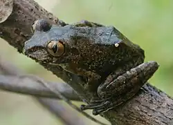 Adult males measure 40–49 mm (1.6–1.9 in) and females 74–87 mm (2.9–3.4 in) in snout–vent length. The dorsum is brown, with darker transverse bars, or green. The tibia has 4–5 bars, and the feet are fully webbed. The iris is rusty red. The tympanum is rather large.[5][6]