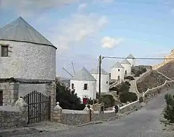 The municipality has an area of 74.172 km2 (28.638 sq mi).[2] The municipality includes the populated offshore island of Farmakonisi (pop. 21), as well as several uninhabited islets, including Levitha and Kinaros, and had a 2021 census population of 7,992, although this figure swells to over 15,000 during the summer peak. The island has a coastline of 71 kilometres (44 miles). It is known for its imposing medieval castle of the Knights of Saint John possibly built on a Byzantine fortress. Nearby islands are Patmos, Lipsi, Kalymnos, and the small islands of Agia Kyriaki and Farmakos. In ancient times it was considered the island of Parthenos Iokallis and linked to the Hellenistic and Roman literature on Meleager and the Meleagrides. The administrative centre and largest town is Agia Marina, with a population of 2,380 inhabitants in 2021. Other sizable towns are Lákki (pop. 2,093), Xirókampos (710), Kamára (673), and Álinda (699).