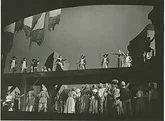 Poulenc expressed a general wish that the opera be performed in the vernacular of the local audience.[11][12][13] Thus the opera was first performed in an Italian translation at La Scala on 26 January 1957, with Romanian soprano Virginia Zeani in the role of Blanche. The original French version premiered on 21 June that year by the Théâtre National de l'Opéra de Paris (the current Opéra National de Paris), where Poulenc had chosen the Paris cast, which included Denise Duval (Blanche de la Force), Régine Crespin (Madame Lidoine), Rita Gorr (Mother Marie), and Liliane Berton (Sister Constance).[6]