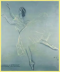 Identifying the premiere of the fuller ballet poses a challenge. One might say that it premiered in 1907 at the Mariinsky Theatre in Saint Petersburg as Rêverie Romantique: Ballet sur la musique de Chopin. However, this also formed the basis of a ballet Chopiniana, which took different forms, even in Fokine's hands.[4] As Les Sylphides, what we consider the work was premiered by Sergei Diaghilev's Ballets Russes on 2 June 1909 at Théâtre du Châtelet, Paris. The Diaghilev premiere is the most famous, as its soloists were Tamara Karsavina, Vaslav Nijinsky (as the poet, dreamer, or young man), Anna Pavlova, and Alexandra Baldina.[5] The long white tutu that Pavlova originally danced in, and that the entire female corps de ballet adopted soon after, was designed by Léon Bakst and inspired by a lithograph of Marie Taglioni dressed as a sylph.