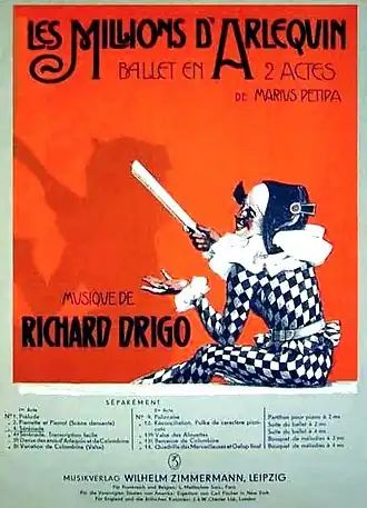 Les Millions d'Arlequin (English: Harlequin's Millions) (Russian: "Миллионы Арлекина", Milliony Arlekina) also known under the title Harlequinade (Russian: "Арлекинада", Arlekinada) is a ballet comique in two acts and two tableaux with libretto and choreography by Marius Petipa and music by Riccardo Drigo. It was first presented at the Theatre of the Imperial Hermitage Museum by the Imperial Ballet in Saint Petersburg on 23 February [O.S. 10 February] 1900.[1] The ballet was given a second premiere with the same cast at the Imperial Mariinsky Theatre on 26 February [O.S. 13 February] 1900.
