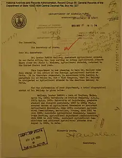 - ^ Foreign Service Operations Memorandum dated June 13, 1949, regarding departure from post of Lester D. MALLORY, FSO, in the personnel records of Lester Mallory in the National Archives, National Personnel Records Center Annex, Valmeyer, Illinois