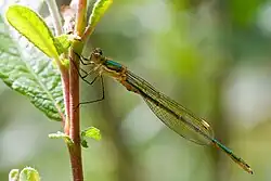 Lestes sponsa is a damselfly with a wide Palaearctic distribution. It is known commonly as the emerald damselfly or common spreadwing.[2] Both males and females have a metallic green colour and brown wing spots. It resides near pools with aquatic plants.[3] When resting its wings are usually half opened.