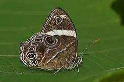 Underside uniform brown; forewings and hindwings with subbasal, subterminal and terminal sinuous lilacine-white lines; forewing with the oblique discal white bar as on the upperside, followed by a subapical lilacine patch bearing three small ocelli in vertical order, and with a very short, oblique, white bar joining it to the costa. Hindwing with a sinuous, irregular, angulated discal lilacine-white line and a strongly arched series of black ocelli speckled with white in the centre, with an inner ochraceous, intermediate brown, and outer lilacine ring. Antenna, head, thorax and abdomen dull brown; antennae ochraceous at apex.[1] Wingspan: 54–64 mm.