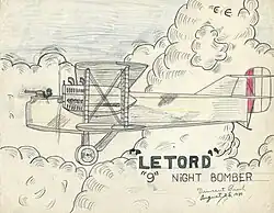 The Letord Let.9 was a night bomber built in France late in the World War I. It was a large biplane of largely conventional design, with unstaggered wings of equal span. The empennage consisted of a single, large, triangular fin and biplane horizontal stabilisers. Twin engines were mounted in the interplane gaps and the main undercarriage units were fitted with dual wheels. The Aéronautique Militaire gave it the designation BN.2 (Bombardement de Nuit - "Night Bomber", 2 seats).