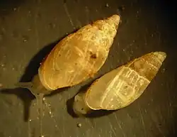 | Leucophytia bidentata on the right and Myosotella myosotis on the left | |