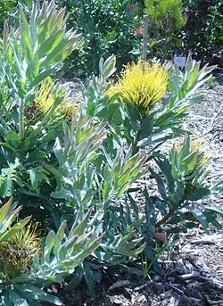 Leucospermum formosum is a large upright shrub of up to 3 m (9.8 ft) high, from the family Proteaceae. It grows from a single trunk and its branches are greyish felty. The softly felty leaves are lance-shaped to elliptic, 6+1⁄2–10 cm (2.6–3.9 in) long and 14–20 mm (0.55–0.79 in) wide. The flower heads are flattened and about 15 cm (5.9 in) across, and consist of bright yellow flowers from which long, styles emerge which are strongly clockwise bent just below the white, later pink thickened tip. From above, the heads look like turning wheels. It is called silver-leaf wheel-pincushion in English. It flowers during September and October. It is an endemic species of the Western Cape province of South Africa.[3][4]