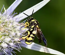 Leucospis is a genus of wasps belonging to the family Leucospidae. Most species are brightly coloured with yellow and black patterning and about 2 cm long. They have characteristically enlarged femurs on the hind leg, with the lower margin toothed. The wings have a longitudinal fold and the long ovipositor is bent over their backs above the abdomen or metasoma. They are parasitic on wasps and solitary bees that construct cells and provision food for their offspring. The Leucospis larvae live and grow as ectoparasites of the host larvae. Usually, only one parasite emerges from a single cell. The genus Micrapion from South Africa is very closely related, and phylogenetic studies suggest merging of the two genera.[1] The genus Leucospis is found across the world in the tropical regions.[2][3]