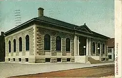 In 1902 Andrew Carnegie donated $60,000 for a new granite building with the understanding that the city would fund staff, books, and materials.[3] Granite was acquired from North Jay and Norridgewock to be used for the construction. The vestibule was modeled after the Greek design with columns 18 feet high and 25 inches in circumference. Woodwork of fine oak is found on the fireplace mantels and oak pillars. The original library located in Lewiston City Hall was known as the Manufacturers and Mechanics Library. The library was formed on January 26, 1861, and existed until the first Lewiston City Hall burned on January 7, 1890. The current library still has several volumes that have the Manufacturers and Mechanics library stamps in them.[4]