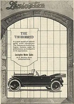 The Lexington was an automobile manufactured in Connersville, Indiana, from 1910 to 1927. From the beginning, Lexingtons, like most other Indiana-built automobiles, were assembled cars, built with components from many different suppliers. The Thoroughbred Six and Minute Man Six were popular Lexington models.[1]