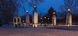 In 1999 he won the international competition to design the Memorial Gates, London, which were inaugurated by Elizabeth II in 2002.[4] In 2004, O'Connor was the architect for the Victoria Cross and George Cross Memorial at the Ministry of Defence Main Building in London.[5] The same year he entered the winning design for the Armed Forces Memorial at the National Memorial Arboretum in Staffordshire, which was official dedicated in a ceremony led by Queen Elizabeth II on 12 October 2007.[6] O'Connor subsequently designed the RAF Bomber Command Memorial, set between Piccadilly and The Green Park in central London, unveiled by Elizabeth II in 2012 during her Diamond Jubilee year.[7]
