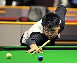 In the 2016 Scottish Open, Liang reached the quarter-finals, where he lost to Yu Delu 4–5.[101] In the Masters, he was one pot away from defeating O'Sullivan 6–4, instead going on to lose 5–6.[102] A 4–0 defeat of Dominic Dale and a pair of 4–3 victories over Mark Allen and Joe Perry moved Liang into the semi-finals of the 2017 World Grand Prix, where he was defeated 1–6 by Barry Hawkins.[98] In the second round of the 2017 World Snooker Championship, Liang trailed Ding Junhui 2–6 after the first session and 7–9 after the second. He then won a trio of frames to take the lead in the match for the first time at 12–11, but lost the match 12–13.[103] After the event, his end-of-season ranking rose to 11, which was his career-high.[104][105]