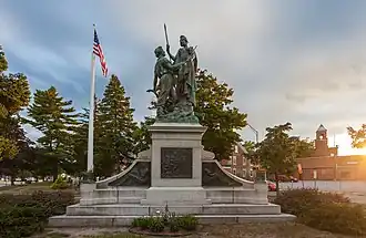 Liberty Arming the Patriot, sometimes called Freedom Arming the Patriot,[2] is a bronze sculpture at Park Place in Pawtucket, Rhode Island, commemorating the participation of the city's citizens in the American Civil War. It was designed by William Granville Hastings and cast by the Gorham Manufacturing Company in 1897. Unlike many Civil War memorials, Liberty Arming the Patriot is a dynamic composition, depicting a young farmer setting his plow aside, and reaching to take a sword from a classical female figure clad in breastplate and wielding a pike. The statue is 11 feet (3.4 m) in height, and is mounted on a granite base 10 feet (3.0 m) high and 22 feet (6.7 m) wide. The sculpture was listed on the National Register of Historic Places in 2001.