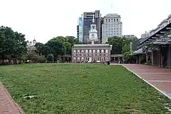 In 1995, the Park Service began preliminary work on a redesign of Independence Mall. Architects Venturi, Scott Brown & Associates developed a master plan with two design alternatives. The first proposed a block-long visitors center on the south side of Market Street, which would also house the Liberty Bell. This would have interrupted the mall's three-block vista of Independence Hall, and made the bell visible only from the south, on Chestnut Street. The second alternative placed a similar visitors center on the north side of Market Street, also interrupting the mall's vista, with the bell in a small pavilion on the south side.[81] City planner Edmund Bacon, who oversaw the mall's design in the 1950s, saw preservation of the vista of Independence Hall as essential. He created his own plan that included a domed bell pavilion built north of Market Street.[82] Public reaction to the possibility of moving the Liberty Bell so far from Independence Hall was strongly negative. NPS announced that the bell would remain on the block between Chestnut and Market streets.[83] Other plans were proposed, each had strengths and weaknesses, but the goal of all was to encourage visitors to see more of the historical park than just the Liberty Bell.[84]