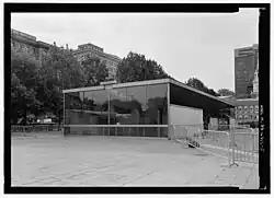 Almost from the start of its stewardship, the Park Service sought to move the bell from Independence Hall to a structure where it would be easier to care for the bell and accommodate visitors. The first such proposal was withdrawn in 1958, after considerable public protest.[75] The Park Service tried again as part of the planning for the 1976 United States Bicentennial. The Independence National Historical Park Advisory Committee proposed in 1969 that the bell be moved out of Independence Hall, as the building could not accommodate the millions expected to visit Philadelphia for the Bicentennial.[76] In 1972, the Park Service announced plans to build a large glass tower for the bell at the new visitors center at S. Third and Chestnut streets, two blocks east of Independence Hall, at a cost of $5 million, but citizens again protested the move. Instead, in 1973, the Park Service proposed to build a smaller glass pavilion for the bell at the north end of Independence Mall, between Arch and Race streets. Philadelphia Mayor Frank Rizzo agreed with the pavilion idea, but proposed that the pavilion be built across Chestnut Street from Independence Hall, which the state feared would destroy the view of the historic building from the mall area.[77] Rizzo's view prevailed, and the bell was moved to a glass-and-steel Liberty Bell Pavilion, about 200 yards (180 m) from its old home at Independence Hall, as the Bicentennial year began.[78]