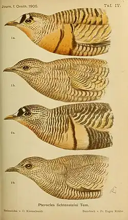 Lichtenstein's sandgrouse (Pterocles lichtensteinii) is a species of bird in the Pteroclidae family, which is named after Martin Lichtenstein. They are nomadic, mostly nocturnal birds, which drink before dawn and after dusk.[2]