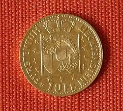 Liechtenstein used the Austrian krone and heller (and the Liechtenstein krone) until 1920,[2] and switched to the Swiss franc due to the krone's instability. Liechtenstein coins are so rare that they do not actually circulate, and no banknotes have been issued, with the exception of three emergency issues of heller in 1920.[3] Most of the Liechtenstein franc coins have the same amount of precious metal as the Swiss franc, except for the coins minted in the late 1980s and 1990s.