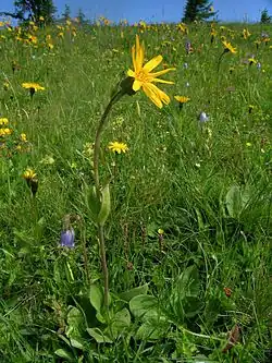 In the subalpine zone, meadows or pastures are almost all of human origin. The plant species present in this environment vary according to exposure, the nature of the soil, and the humidity of the climate. In general, mowing favors plants with bulbs that flower very early in the spring (crocuses) or very late (colchicums). The pastures, subjected to even stronger pressures, favor the emergence of tough species that the animals neglect, such as matgrass. This is often accompanied by mountain arnica or wolf's bane. Wet places are the domain of the megaphorbs, characterized by tall plants (Adenostyles alliariae, Cicerbita alpina, Aconitum napellus, Thalictrum aquilegiifolium, Delphinium elatum, etc.). Finally, in places where livestock stay for a long time, the abundantly smoky soil is very rich in nitrogen and is suitable for species such as Rumex alpinus, Chenopodium bonus-henricus, and Cirsium spinosissimum.