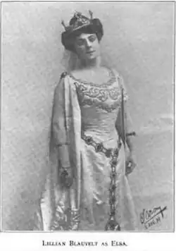 Lillian Blauvelt (1873–1947)[1] was a popular opera singer in New York City and internationally in the first decade of the 20th century. Her voice was a lyric soprano with a very pure timbre and dramatic distinction. Her vocal range was from G to D.[2] She was from Brooklyn, New York, and eventually toured every country in Europe.[3]