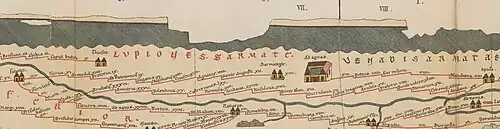 At least 12, and up to 16, forts are recorded on the Tabula Peutingeriana most of which have been confirmed by archaeological research, starting from the north:[4][5][6]
