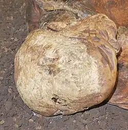 Lindow Man's last meal was preserved in his stomach and intestines and was analysed in some detail.[39] It was hoped that investigations into the contents of the stomach would shed light on the contemporary diet, as was the case with Grauballe Man and Tollund Man in the 1950s. The analysis of the contents of the digestive system of bog bodies had become one of the principal endeavours of investigating such remains.[40] Analysis of the grains present revealed his diet to be mostly of cereals. He probably ate slightly charred bread, although the burning may have had ritual significance rather than being an accident.[41] Some mistletoe pollen was also found in the stomach, indicating that Lindow Man died in March or April.[42][43]