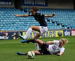 Johnson's football career began at the age of 11 years when she joined a girls club.[5] She also played for Coventry City on one or two occasions while attending Manchester Metropolitan University.[6] However, her Premier League career began relatively late when she joined Liverpool Ladies, from where she joined Everton Ladies in 2003.[5] Everton fans gave her the nickname "Lindsay Lightning" due to her pace.[7] She played for Everton in their 1–0 FA Women's Cup Final defeat to Charlton Athletic Ladies in 2005, earning the Player of the Match award.[8] She also played in Everton's League Cup win in 2008, beating Arsenal Ladies in the final.[9]