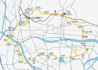 Line 11 of the Guangzhou Metro (Chinese: 广州地铁11号线; pinyin: Guǎngzhōu Dìtiě Shíyīhàoxiàn) is a fully automated rapid transit line in Guangzhou. It is a loop line around the city center, connecting Guangzhou railway station, Guangzhou East railway station, Pazhou, and Fangcun.[2] It opened on 28 December 2024, minus the two major railway stations due to issues on China Railways' part.