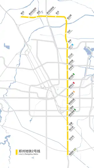 Line 2 of the Zhengzhou Metro (Chinese: 郑州地铁二号线; pinyin: Zhèngzhōu Dìtiě Èr Hào Xiàn) is a rapid transit line running from north to south of Zhengzhou. It opened on 19 August 2016. The line is currently 30.9 km long with 22 stations.[3][1][2]