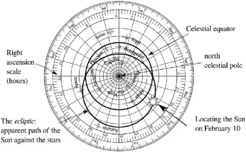 The rete, representing the sky, functions as a star chart. When it is rotated, the stars and the ecliptic move over the projection of the coordinates on the tympan. One complete rotation corresponds to the passage of a day. The astrolabe is, therefore, a predecessor of the modern planisphere.