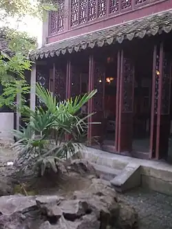 | Celestial Hall of Five Peaks (五峰仙馆) This five bay full gable structure was inspired by a verse from Li Bai, "There are five peaks to the south of Mount Lu which seem to be the golden lotus flowers cut out by nature". The selection of this verse was in turn was inspired by the preexisting Ming dynasty grotto which faces the front of the hall.[2] On the backside of the Hall a courtyard houses one of the 12 famous scholar stones, Rhesus Monkey Peak, of Liu Su's collection. Inside are numerous pillar couplets. |