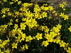 Linum flavum, the golden flax or yellow flax, is a species of flowering plant in the family Linaceae, native to central and southern Europe. It is an erect, woody perennial growing to 30 cm (12 in) tall by 20 cm (8 in) broad, with dark green, semi-evergreen leaves, and terminal clusters of bright yellow, five-petalled flowers in spring.[2] The Latin flavum means "pure yellow".[3]