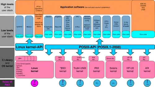 The Linux API includes the kernel–user space API, which allows code in user space to access system resources and services of the Linux kernel.[3] It is composed of the system call interface of the Linux kernel and the subroutines in the C standard library. The focus of the development of the Linux API has been to provide the usable features of the specifications defined in POSIX in a way which is reasonably compatible, robust and performant, and to provide additional useful features not defined in POSIX, just as the kernel–user space APIs of other systems implementing the POSIX API also provide additional features not defined in POSIX.