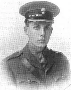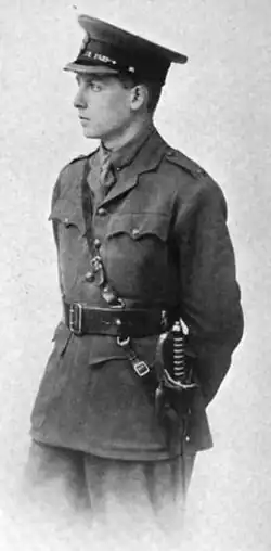 Harvard planned to become a medical missionary, but on returning to London immediately after graduation he enlisted in the British Army.[5]: 14 "It is all of a piece with the devotion which the best young men of Europe are rendering to their flags," said the Harvard Alumni Bulletin.[26] He joined the Inns of Court Officers' Training Corps on 12 July 1915[27] and was commissioned a second lieutenant in the Grenadier Guards on 28 September.[28] He was promoted to lieutenant in January 1916[29] and joined the 1st Battalion in France on 8 March 1916.[30]