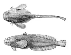Liparis montagui, or Montagu's seasnail, is a marine fish of the seasnail family (Liparidae). It inhabits the northeastern Atlantic, mainly around the British Isles, the North Sea, the Norwegian Sea, southern Iceland and as far north as the Barents Sea. It is a small (maximum 12 cm), demersal fish, usually living between from the intertidal zone to 30 metres deep, where it hides under stones or algae. It mainly feeds on small invertebrates, such as small crabs, shrimp and amphipods.[2] This species was described in 1804 by the Anglo-Irish writer, natural history illustrator, and amateur zoologist Edward Donovan with England given as the type locality.[3] The specific name honours the English naturalist George Montagu who provided Donovan with an illustration and a description of this "beautiful little fish".[4]