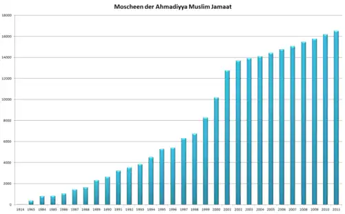 This is a list of worship places, hospitals, schools and other structures throughout the world that are constructed/owned by the Ahmadiyya Muslim Community, arranged according to their respective countries. Additional information pertaining to the countries is also included. As of 2009, the Ahmadiyya Muslim Community had built over 15,055 mosques,[1] 510 schools, and over 30 hospitals;[2]: 14, 33 and was established in 206 countries.[3]