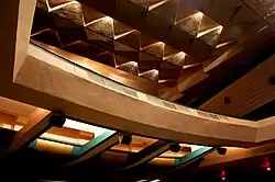 Art Deco features abound in the design of the Auditorium and include the gradual curves, the ribbed piers and geometric volumes and patterns. Above the orchestra section are star or diamond like patterns which also serve as lighting fixtures. Above the balcony are triangles which also serve as air conditioning ducts. These, together with the green and gold theme, and the subtle lettering of "FEU" under the boxes were all combined in a regal manner. The interior was restored in 2002-2003 and was also infused with new lighting, sound and video equipment. It was the only postwar venue with air-conditioning and a revolving stage. It used to be the Cultural Center of the Philippines in the 1950s given that all the foremost Filipino and foreign performers of the time performed there.